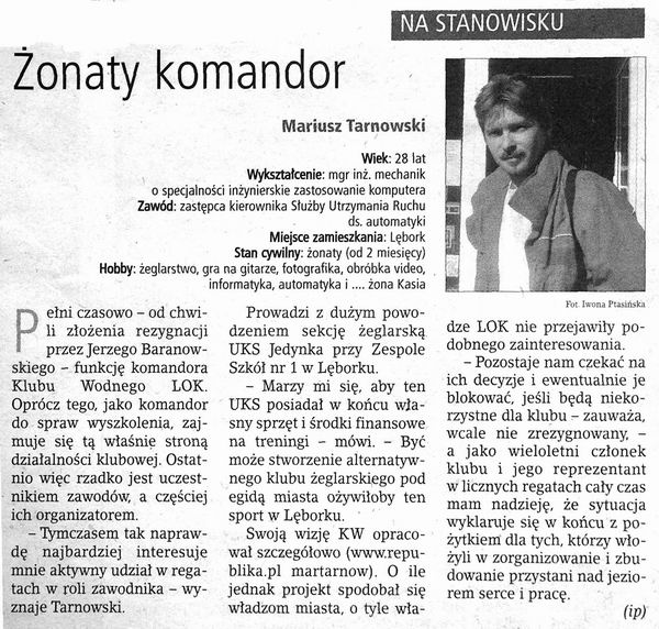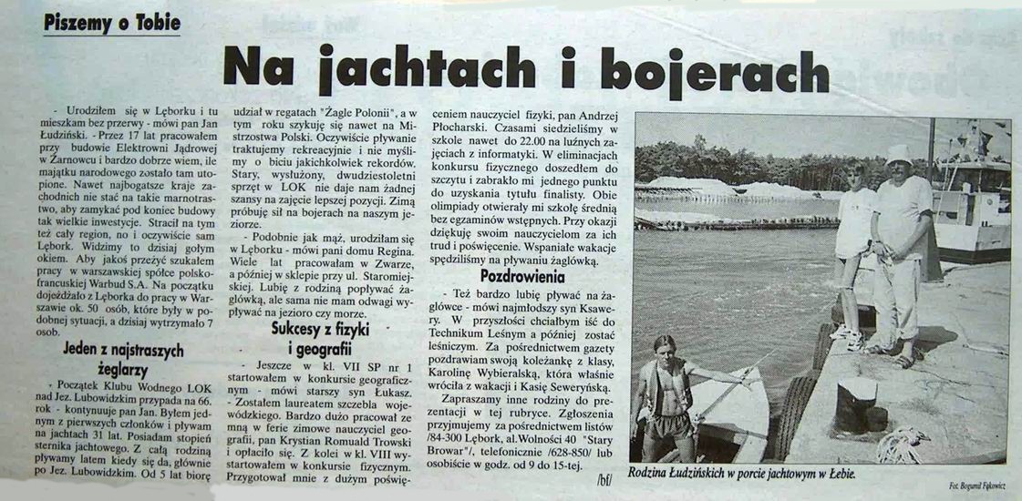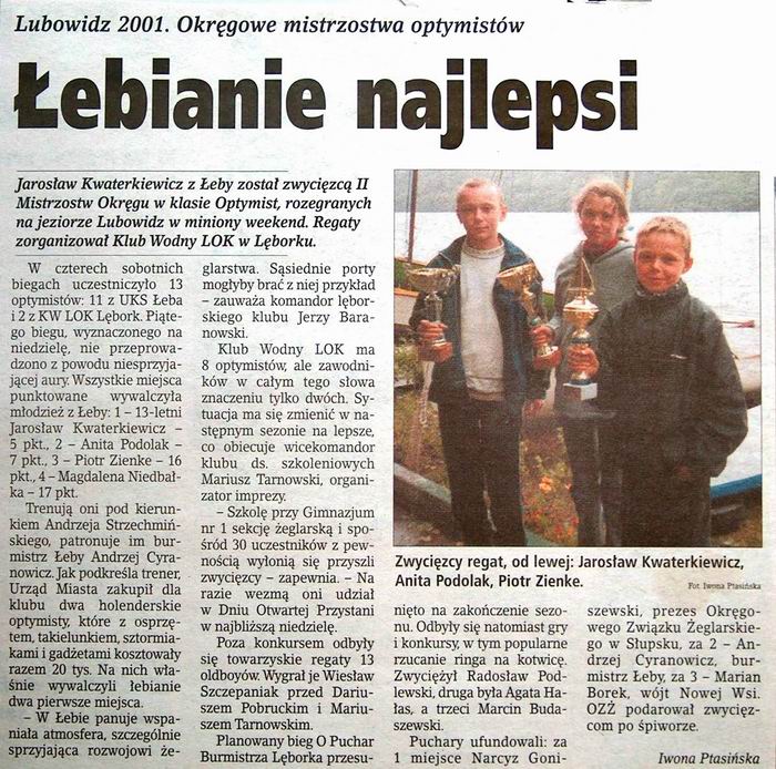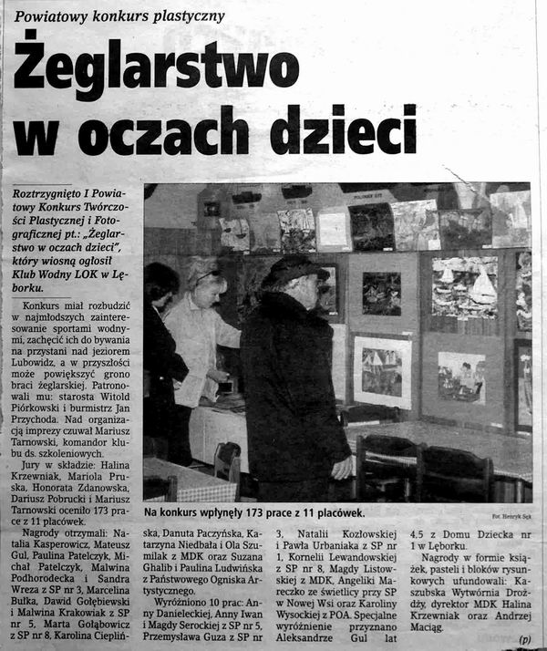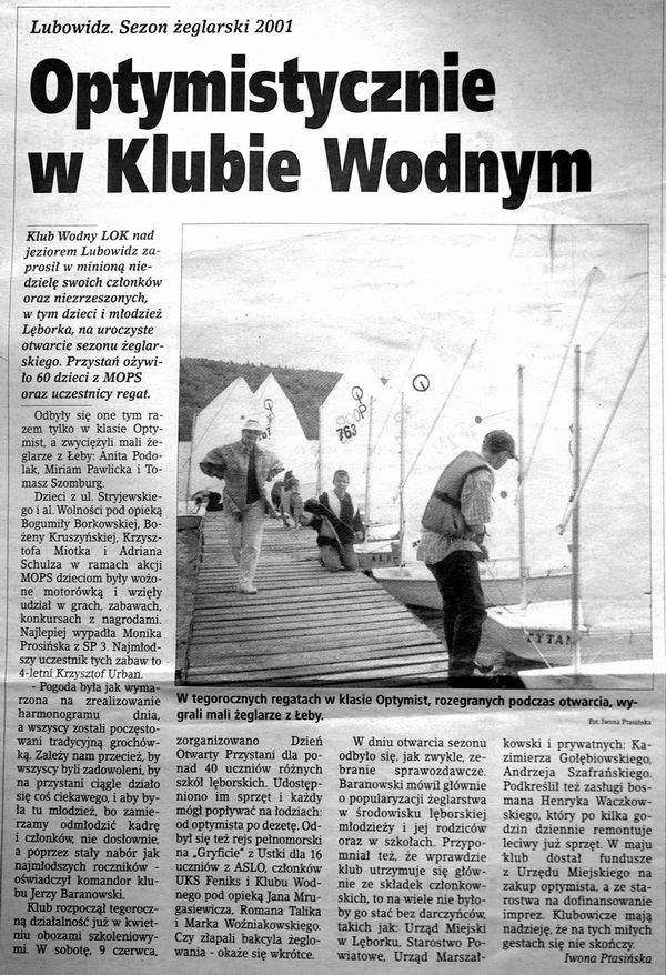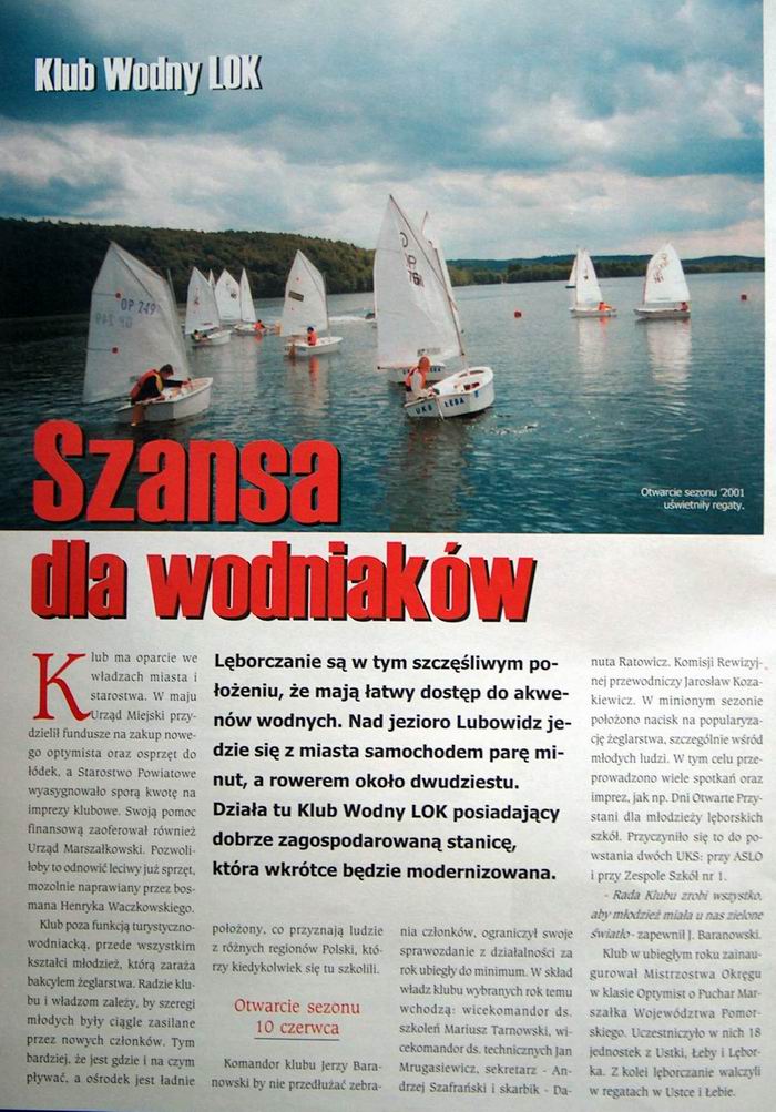 jub_50lecia.jpgObchody Jubileuszu 50-cio lecia Klubu Wodnego LOK |  konk_pl_01.jpgI powiatowy konkurs plastyczny zorganizowany przez KW LOK Lębork w 2001r. |  lodzinski_98.jpgArtykuł o Łukaszu Łudzińskim (zdaje się że w 1998r.) |  ludz_99a.jpgArtykuł m.in. o Łukaszu Łudzińskim (zdaje się że w 1998-99r.) |  mag_01.jpgObszerny artykuł z 2001 o klubie str1 |