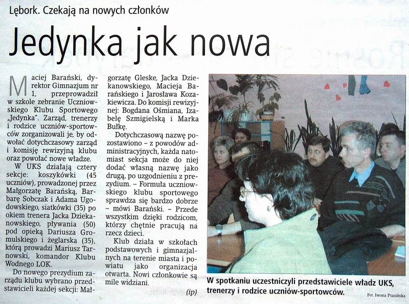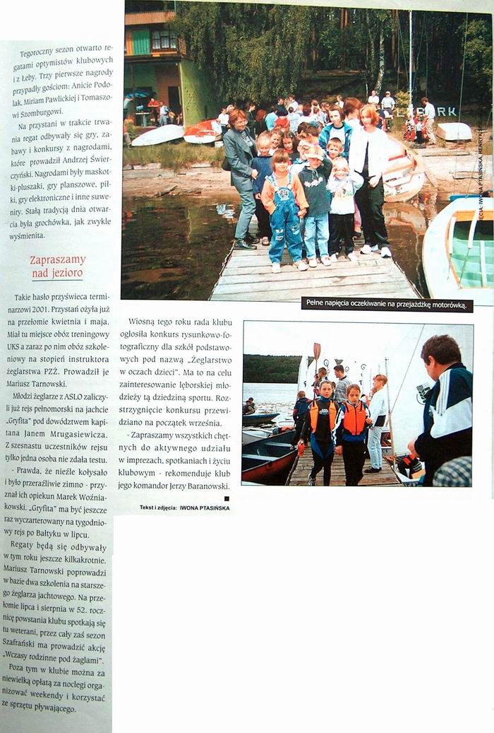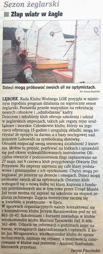 sez_01.jpgOtwarcie sezonu 2001 |  uks_pwst.JPGRozszerzenie działalności UKS jedynka z Lęborka. 2003 |  walne_02.jpgKontrowersyjny artykuł z 2002 po walnym zebraniu członków Klubu Wodnego LOK |  zagle_98.jpgŻagle Poloni 1999 ? |  zak_sez_02.jpgZakończenie sezonu żeglarskiego 2002 |