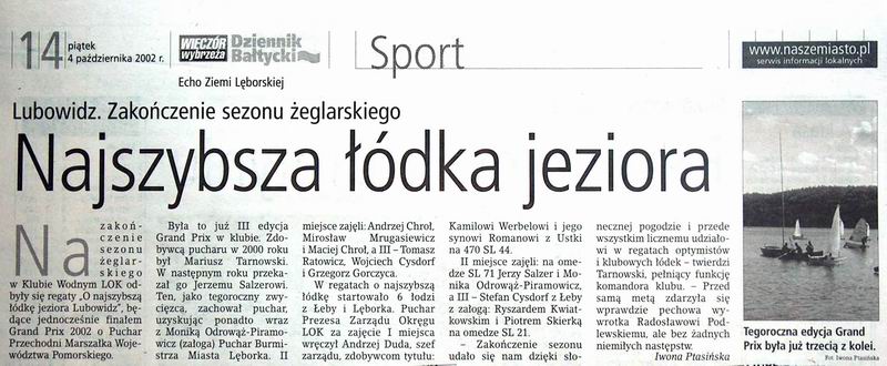 zaks_97.jpgZakończenie sezonu żeglarskiego (gdzieś w okolicach 1997 ?) |  zaks_98.jpgZakończenie sezonu żeglarskiego 1998 |  zaok_1998.jpgZakończenie sezonu żeglarskiego 1996 ? |  zap_plnb.jpgZaproszenie na konkurs PlnB 2003 |  Artykuł ukazał się w DB 5.06.2003 (tu jestem sam zdziwiony jego ukazaniem). Prawdopodobnie mat. są ze strony internetowej. |
