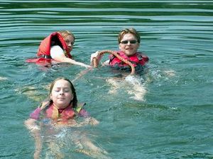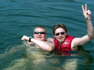 | Wszyscy rzecz jasna posiadający umiejętność pływania (dodatkowo w kamizelkach żeby móc polegiwać na wodzie) pod czujnym okiem ratownika - Ronalda Ramczyka. | ||
