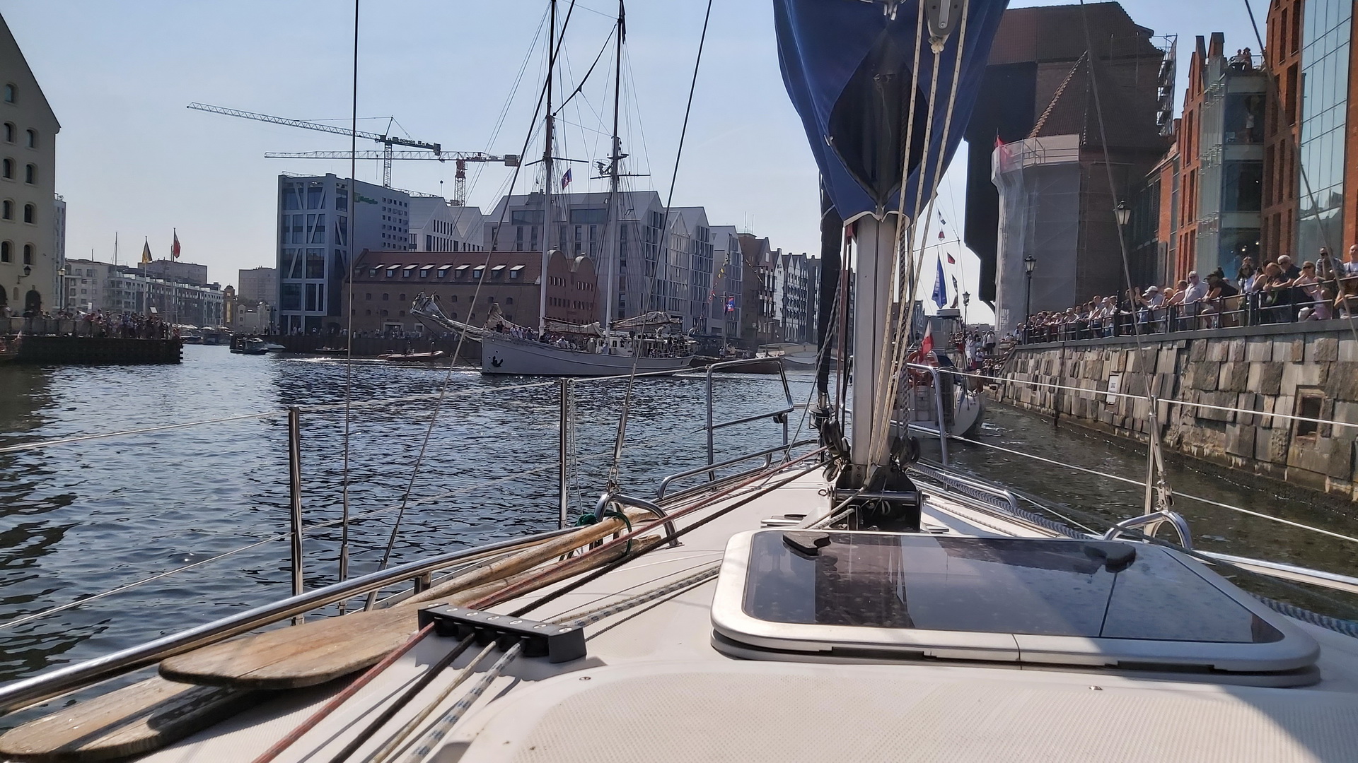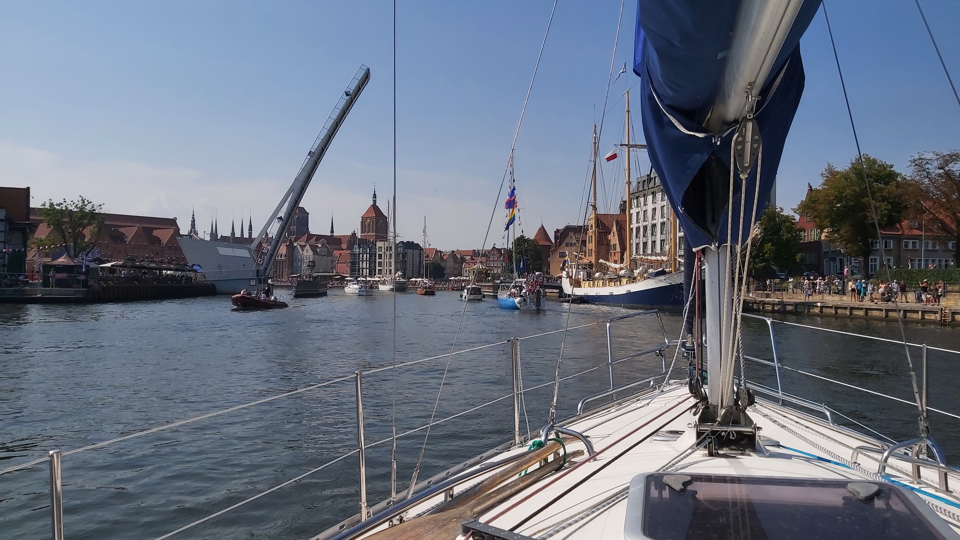 Widok z pokładu jachtu GRAN na paradzie żaglowców po Motławie w Gdańsku.