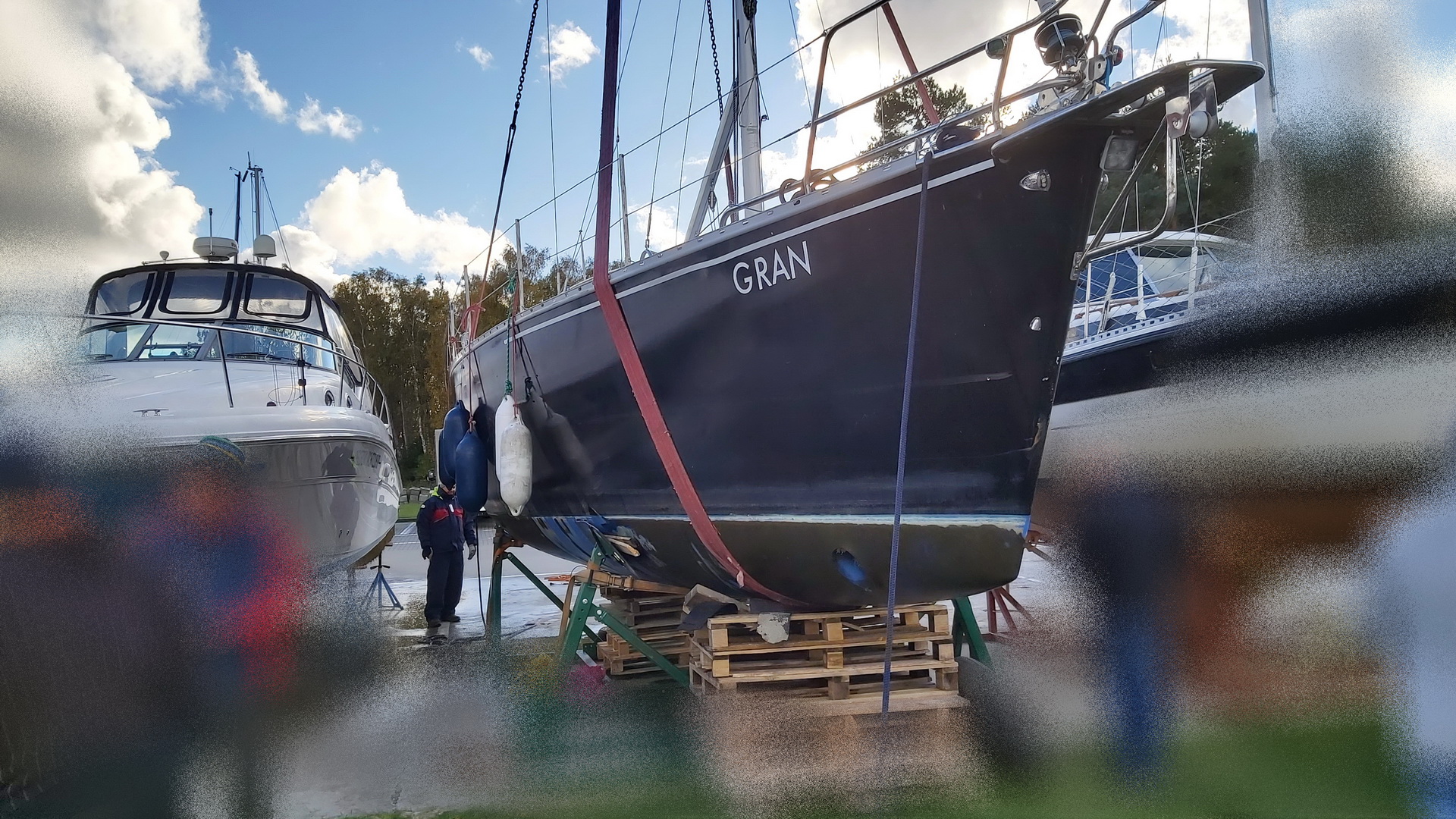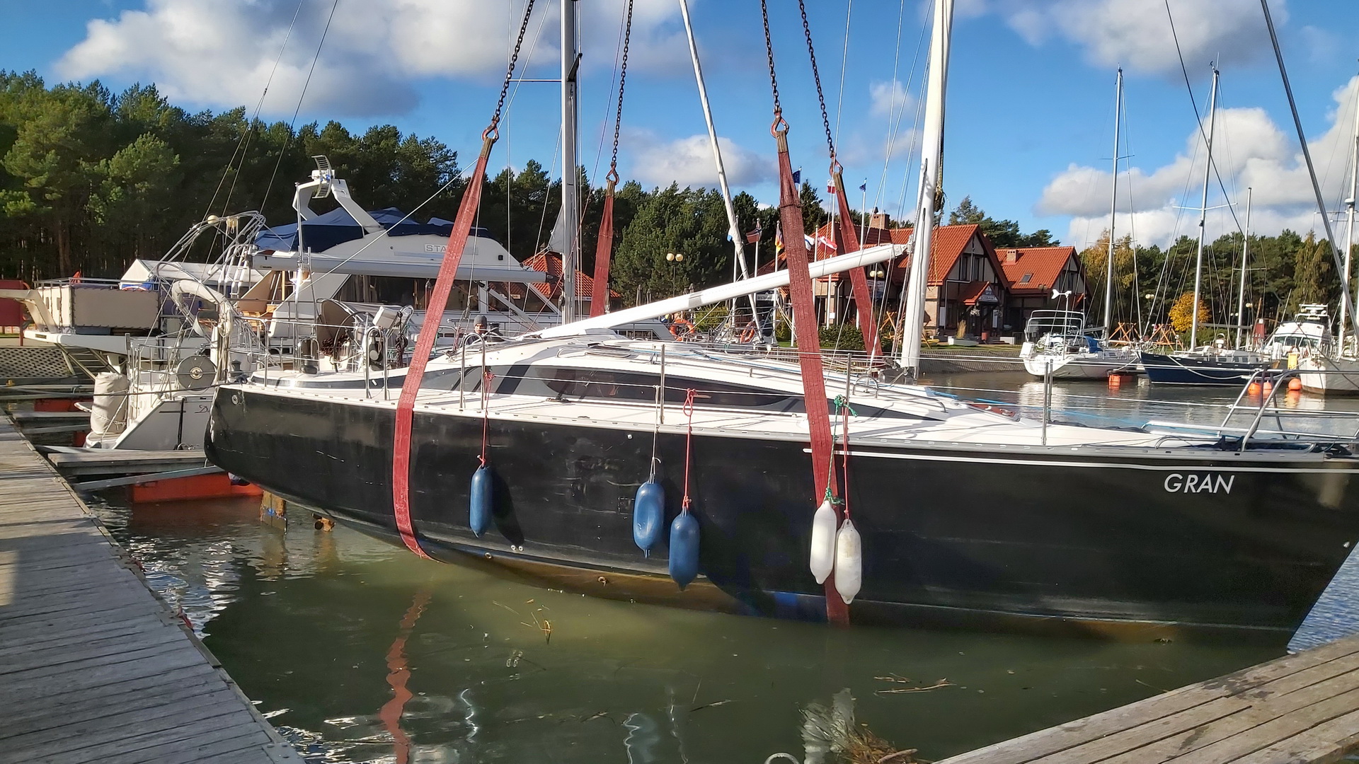25.10.2021 Port Łeba - akcja wyciągania jednostek. Jacht stowarzyszenia MMM - GRAN spoczął na paletach i na świeżo zakupionym stojaku.