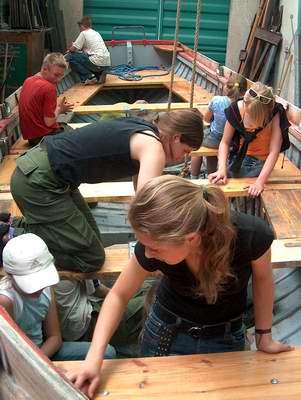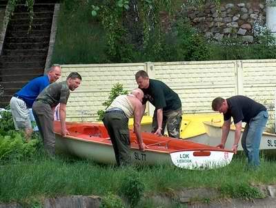 Na zdjęciu powyżej widać prace przy SL-69. Zanim wymienimy w niej pokład trzeba ją i tak połatać i zrzucić na wodę. Tomasz Niewolin przyprowadził swoją drużynę w sile ~30 osób. Tylko wióry leciały jak się wzięli do pracy.