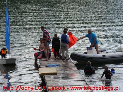 W piankach strasznie ciepło. Dzieci kiedy mogą to wskakują do wody. UKS Łeba zadbał o asekurację, mają swoją motorówkę.