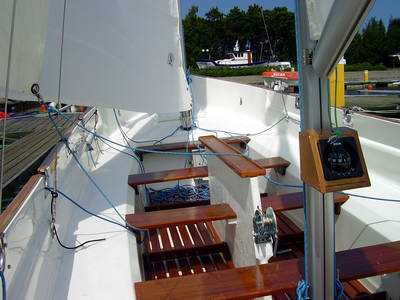 Jeżeli zostanie zastosowane inne rozwiązanie montażu silnika - znacznie dalej od pawęży w osi jachtu to konieczne będzie założenie manetki, rozruchu elektrycznego i sterociągów, gdyż jak wynika z pierwszych prób do manewrowania tą jednostką w porcie najlepiej sprawdza się kierowanie silnikiem (nie sterem który reaguje dopiero przy odpowiedniej prędkości manewrowej a i tak promień skrętu jest czasami zbyt duży na ciasną marinę)