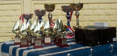 Na zdjęciu część trofeów, które można było zdobyć w regatach. Niżej wymienione firmy, organizacje ufundowały nagrody, puchary, słodycze .... Dziękujemy!