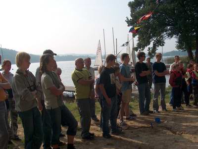 Oficjalne rozpoczęcie regat. Szkoda, że nie dojechali Optymiściarze z sąsiednich klubów. Często jednak dochodzi do nakładania się kalendarzy klubowych. Nasi harcerze - grupa "cadet" mieli z kolei w ten weekend zgrupowanie w Łebie z którego w dziale artykuły znajduje się fotorelacja (z żeglowania na DeZetach).