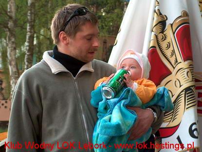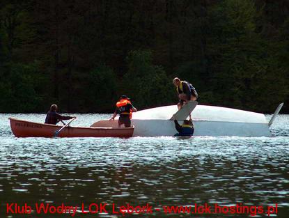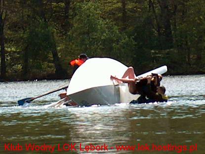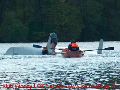 Stoi! Roland włazi na pokład. Załoga na balaście ma nie wesoło. Sternik zamoczył się tylko do kolan ;). Darek pływa już trochę i nie jedną wywrotkę zaliczył. Nabiera się takiej wprawy, że stawia się łajbę nie mocząc się dalej niż do kolan. Problem z postawieniem jak się okazało w tym testowym rejsie był wynikiem szybkiego nabierania wody w komory wypornościowe. Będzie trzeba dokładnie wszytko przejrzeć i połatać nieszczelności. Aczkolwiek i tak uważam że nie ma to jak wypełniona komora butelkami PCV po wodzie mineralnej czy Coli 2l. Zawsze jest pływalność a pojemność wolna którą może zalać woda jest niewielka.