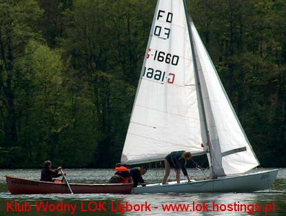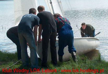 Jednak dziś nie tylko praca była na przystani. Mieliśmy dziś pierwsze wodowanie jednostki żaglowej - FD (Flaying Dutchman - Latający Holender). Zakupiony w tym roku przez członków klubu sprzęt ma parę lat, ale jest naprawdę w niezłym stanie i niźle wyposażony. Bardzo ciekawe rozwiązania wielu patentów. Bloczków, linek co nie miara. Laatający Holender jest bardzo wymagającą łódką. Sam sternik nic tu nie zrobi ( o czym się chłopaki przekonali dziś). Powierzchnia genui jest niewiele mniejsza od grota (8m^2), jej nie wyluzowanie w szkwale wystarczy do zaliczenia grzyba nawet jeśli grot będzie w łopocie.