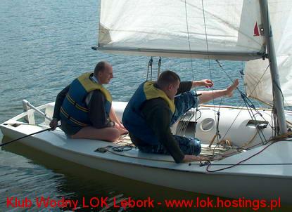 Koledzy nabierają szacunku do 18m^2 ożaglowanie podstawowego na dwie osoby. Ta łódka jest naprawdę wymagająca. Zaknagowana genua wystarczyła do położenia łajby w małym szkwale.