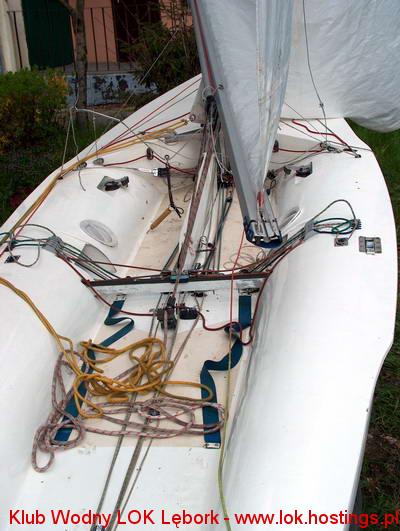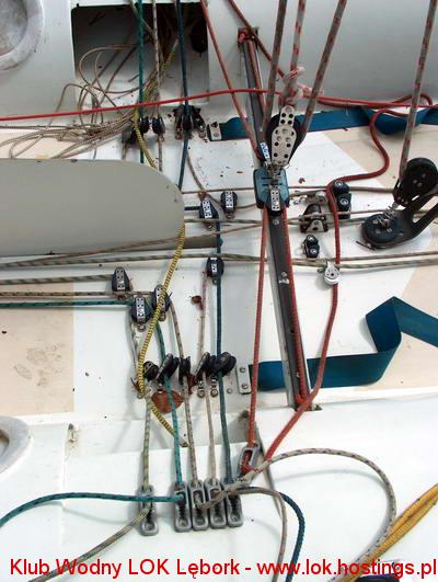 Jak widać na powyższym zdjęciu użyto zupełnie przyzwoityego osprzętu: bloczki, knagi Harkena oraz Rostana. Gdy się rzadko pływa warto opisać poszczególne fały, kontrafały, szoty, brasy itd.
