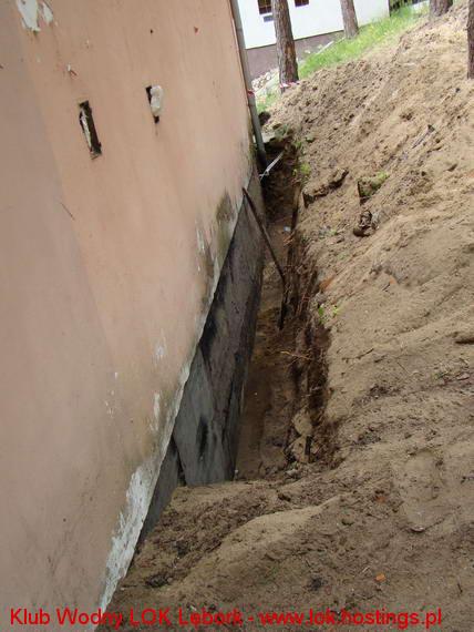 Widać koniec odkopywania izolacji. Zmieniona została technika odkopywania. Co deszcz to ze skarpy zjeźdżał piach i zawalał wykop. Teraz co kilka metrów od razu jest kładziona izolacja i zasypywana.