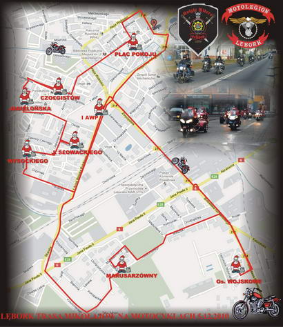 ... zostanie wykonany przejazd mikołajkowy na motocyklach w strojach mikołajkowych. Start odbędzie się z Pl. Pokoju o godzinie 12.30 trasa to osiedla Czołgistów, Jagiellońska, Leg. Polskich, Wysockiego, I Armii W.P. Osiedle Sportowe i Osiedle Wojskowe. Każdy z klubów odwiedzi ustalone przez siebie obiekty w których czekają dzieci na Mikołaja. Knight Riders - Dom Małego Dziecka, Motolegion Oddział szpitalny dzieci w placówce ZOZ Lębork.