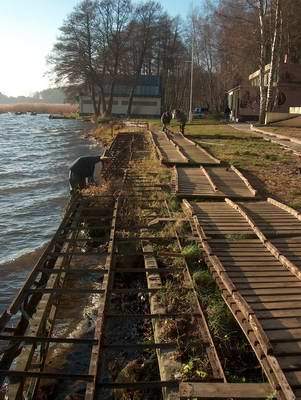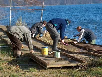 W tym samym czasie nad jeziorem trwa spóźniona (w końcu mamy grudzień) akcja konserwacji pomostu.