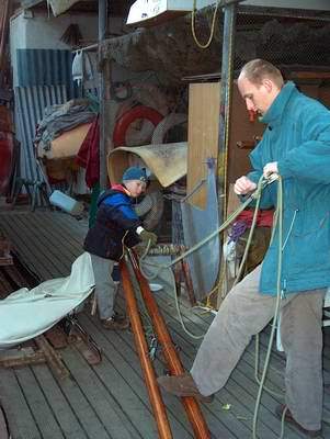 Darek z synem porządkowali żagle. Brak bosmana na zakończenie sezonu skutkował nie przypilnowaniem pewnych spraw.
