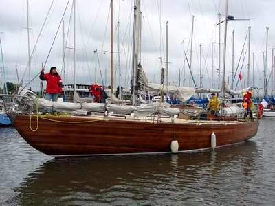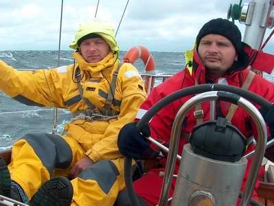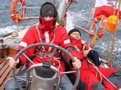 Na zdjęciu wyżej: Mariusz i Maciej - w drodze do Cuxhaven (ujście Elby). Jak na rzekę to nieźle dawało. Lubię te klasyczne konstrukcje drewniane - pięknie się na nich sztormuje. Na plastkach jest niesamowity łomot i źle chodzą na fali. Nadają się do jachtingu.