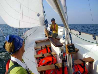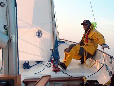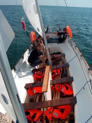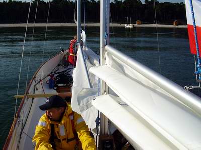 Układ żagli nie pozwala na obserwację horyzontu z miejsca sternika. Na dziobie musi ktoś siedzieć w charakterze "oka" szczególnie na torze podejściowym do Gdyni, gdzie jest spory ruch.
