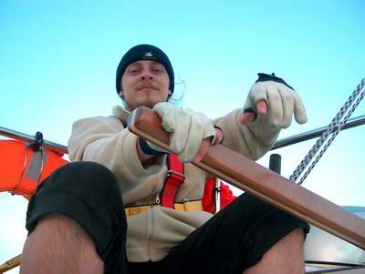 Gumiś pełen pasji za sterem (w starym moim sztormiaku który mu pożyczyłem w zeszłym roku - ciekawe kiedy odda ;) )