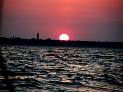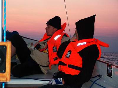 Typowe żeglarskie klimaty. Zachód słońca. Czas zapalić światła pozycyjne.