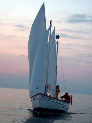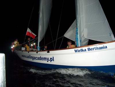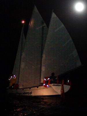 Zapada zmierzch. Podejmujemy decyzję, że przy tak korzystnych prognozach wykorzystujemy wiatr i gonimy na pełnych żaglach do Łeby. (Zwykle na noc redukuje się ożaglowanie, tak na wszelki wypadek). Niebo jednak było czyste, gwiazdy doskonale widoczne i nie spodziewaliśmy się porywistego wiatru.
