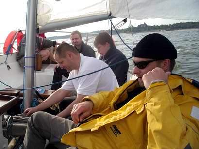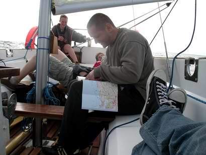 Postawiliśmy szmaty. Prędkość jednak nie była satysfakcjonująca. Założyliśmy że przelot z wiatrem będzie trwał około 4h a z powrotem jakieś 8h (halsówka). Przez jakieś 0,5h szliśmy na dopalaczu. Potem zrobiło się 2-3B a później 4B. Prędkość była już przyzwoita i odstawiliśmy katarynę.