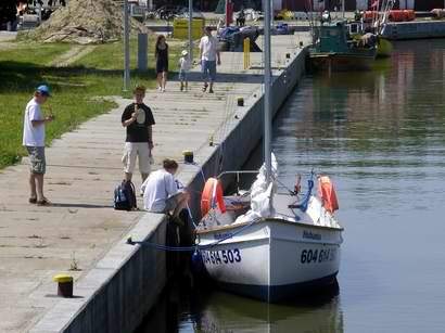 Na wszelki wypadek uzupełniamy paliwo do pełna. Niektórzy jutro muszą być w pracy :( . Na fotce Kasia niefrasobliwie steruje w kanale Łebskim