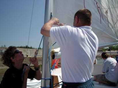 Jak jachting to jachting. Marek przygrywa skocznego begina. Bratek (sporo ćwiczył) grał klasykę a ja fałszowałem po swojemu coraz gorzej zresztą (brak czasu - tylko w rejsach łapię za gitarę ;). Na pierwszym planie Marcin Szczęśniak - studiuje apę turystyczą.