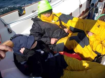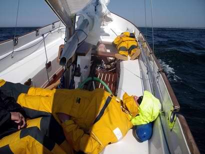 DeZeta jednak ma słaby kąt natarcia na wiatr. Po dwóch halsach stwierdziliśmy, że do północy nie dojdziemy do Łeby. Nie wspomnę, że trzeba było jednak pompę zęzową uruchomić. Fala regularnie wjeżdżała do środka (chociaż wiało tylko 4B!). Tomek Niewolin jak napisał w shoutboxie nigdy więcej nie uwierzy prognozom i zawsze będzie brał sztormiak. Ja do tego doszedłem wcześniej, ale teraz dorzucam że kalosze też. Zmarzłem przez zmoczone trampki że nie pytajcie.