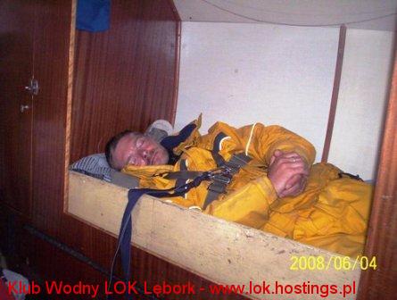 Powyżej 6B przy nieznanej odporności załogi wolę spać w gotowości do szybkiego wyskoczenia na pokład bez żmudnego się ubierania w betoniarce. Mam tak od czasu jak tak kiedyś w nocy wyskoczyłem i nie dość że oczywiście dostałem falą (bez sztormiaka) to jeszcze jeździłem na bomie bez zabezpiecznia (pasów) bo pieski puściły na talii grota (taki mały sztormik był wówczas). Widać powyżej że się zapieram rękami. Tu była już dość rozbudowana fala i starsznie rzucało w koi (musiałem się w nią wbić ;). Fotka zrobiona w drodze powrotnej z wyspy (tylko wówczas nam tak mocniej przywiało)