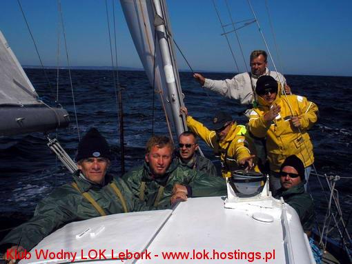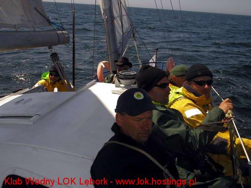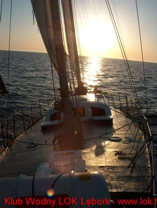 Stan wody 3-4B, ale wiatr 4B. Zdejmujemy refy na grocie, ale zostajemy na podstawowym foku. Wiemy ze ma przywiac. Gnamy bajdewindem ponad 7 wezlów. Po poludniu wiatr wzrósl do porzadnej szóski a w porywach do 7B. Na grocie dwa refy a suniemy dalej ponad 7 wezlów. Fala ma dobre 3m. Jacht zaczal sie mozolnie na nia wspinac i zjezdzac w dosc emocjonujacy sposób budzacy lekki przestrach wsród czesci zalogi. To, ze rufa jest w wodzie juz dawno przestalo robic wrazenie (taka wada konstrukcyjna J-80).