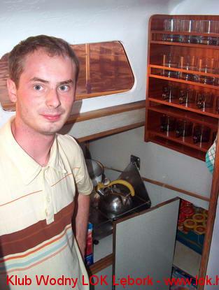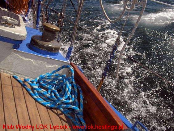 JACHT: s/y Mestwin to jacht historia. Dzielnosc morska jest duza, jednak jak na oferte czarterowa to nieco warto by tam pozmieniac. Strasznie wkurzalo mnie smiesznie male kolo sterowe, to ze ze stanowiska sternika nic nie widac (jak sie stanie - ciezko siegnac kola sterowego), silnik o mocy 27kM do napedzania 13 tonowego jachtu to nieporozumienie. Obecnie na jednostkach podobnej wielkosci o dwukrotnie mniejszej masie jachtu wstawiaja silniki ponad 100KM. Taka moc umozliwia zegluge na silniku pod wiatr o sile 8B z predkoscia 6 wezlów!!! 27KM na tej lajbie nie pozwalalo nam wyjsc z portu przy 5-6B, ale o tym w dalszej czesci....
