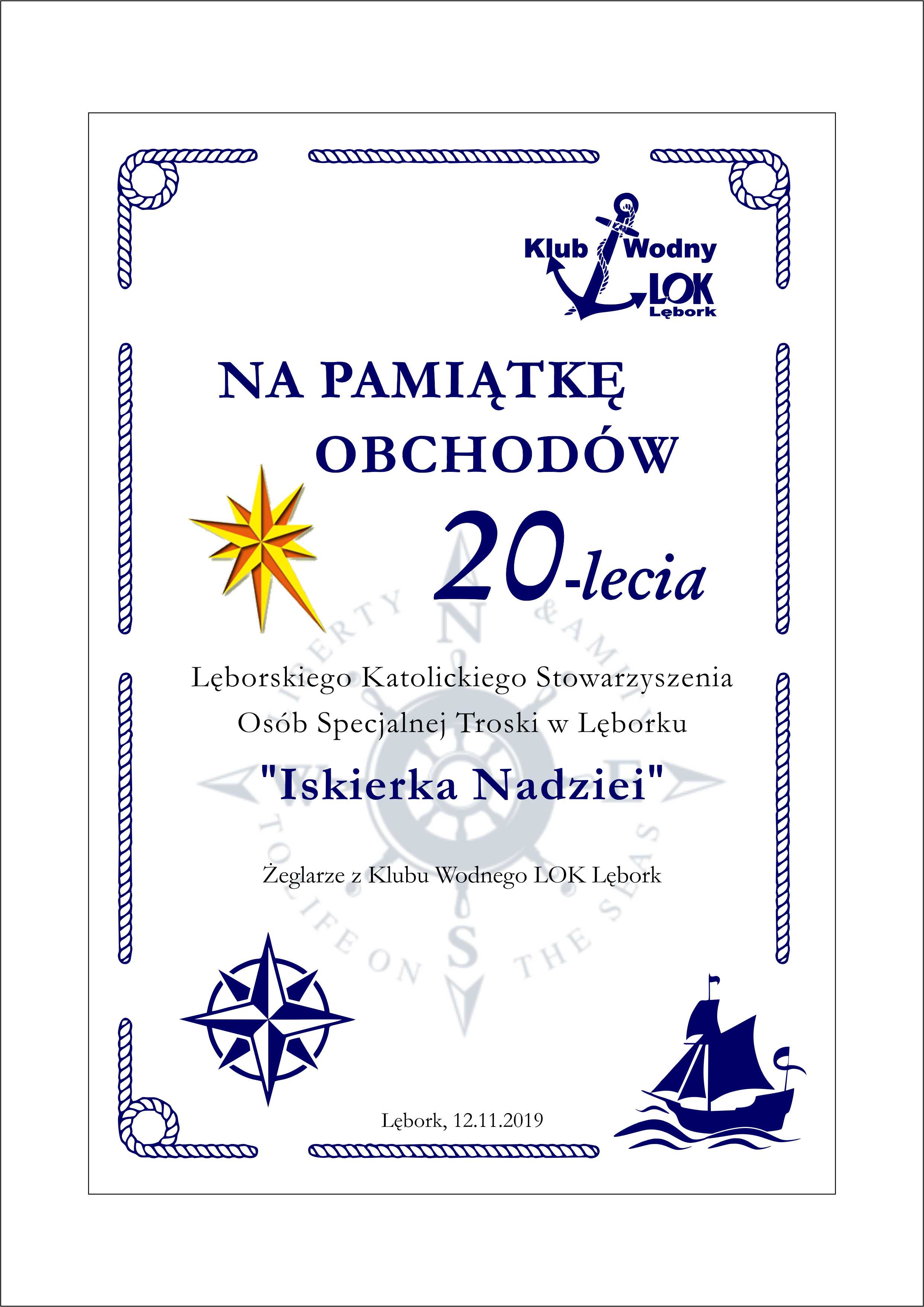 Gratulujemy XX lat owocnej pracy. Życzymy Wam dalszych sukcesów w trudnej i znojnej pracy. Wytrwałości i sił do kontynuowania wspaniałej inicjatywy jaką jest Wasze stowarzyszenie. Gratulacje dla całego stowarzyszenia, zarządu i szczególnie dla p. Barbary Gulgowskiej - prezes stowarzyszenia. Dużo sił i usm,iechu na co dzień. / Klub Wodny LOK LĘBORK