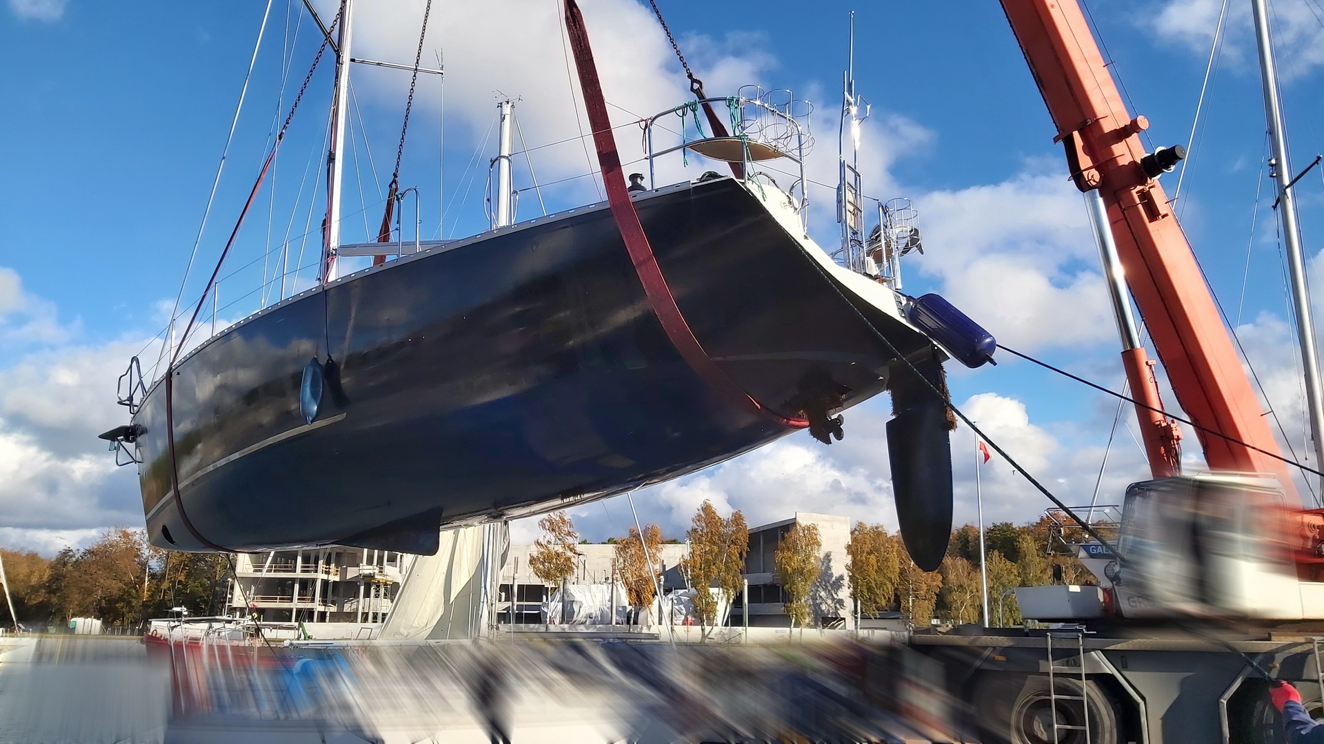25.10.2021 Port Łeba - akcja wyciągania jednostek. Jacht stowarzyszenia MMM - GRAN spoczął na paletach i na świeżo zakupionym stojaku.